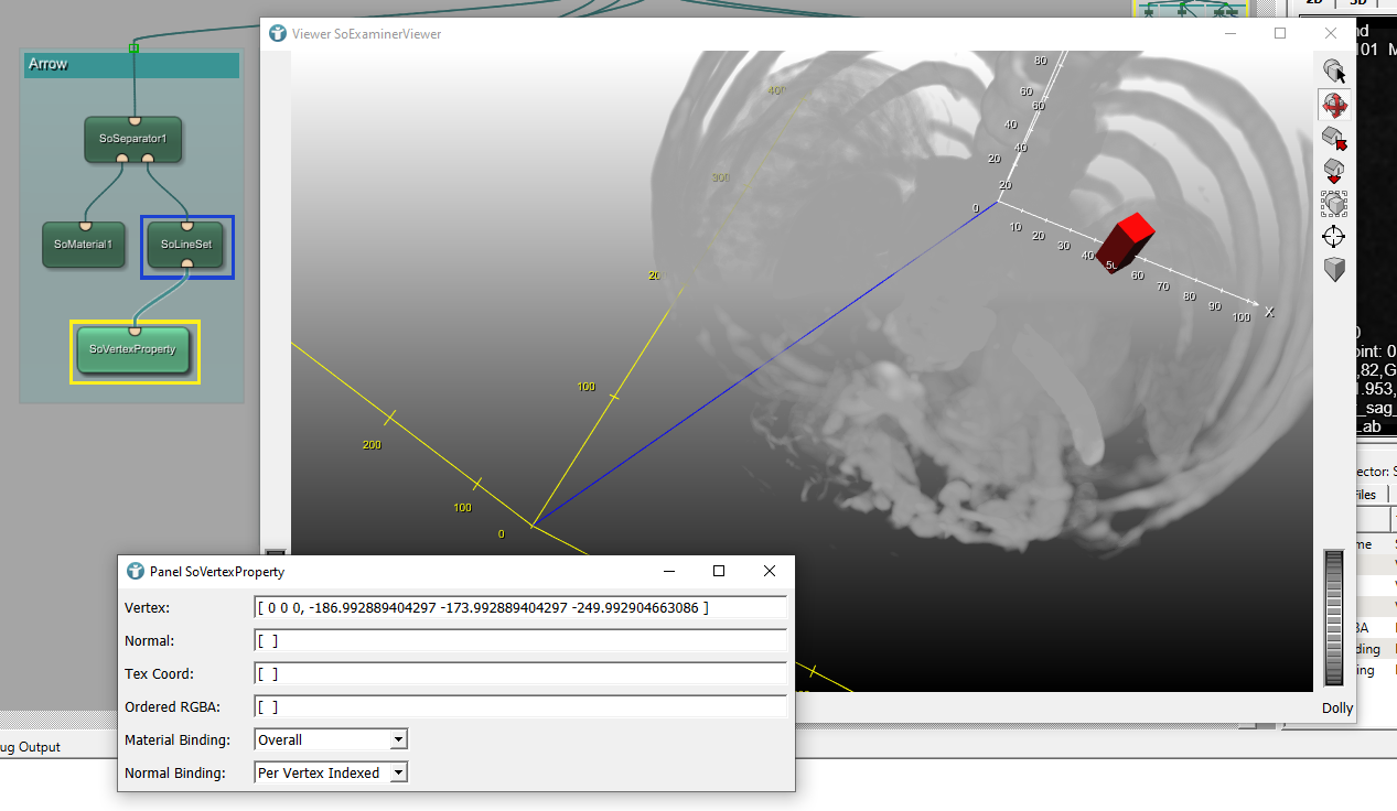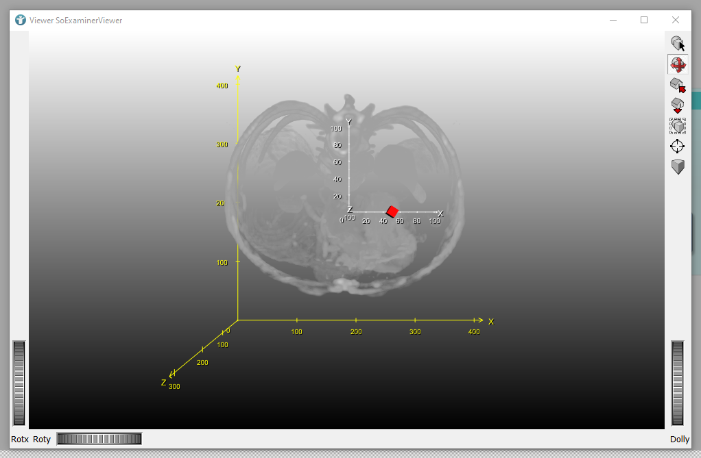 Opening the SoExaminerViewer shows the world coordinate system in white and the voxel coordinate system in yellow.