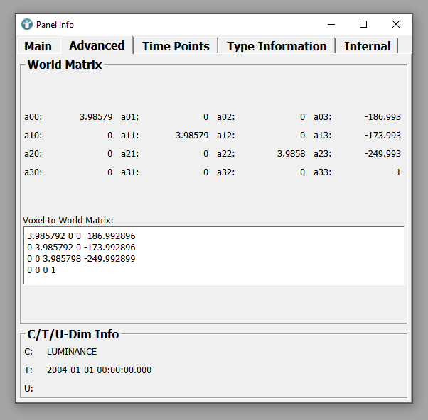In addition to that, you can see a scaling that has been done on the image. The voxel sizes are shown in the diagonal values of the matrix as 3.985792, 3.985792, 3.985798.