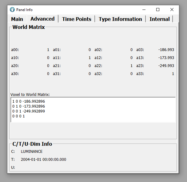 The Advanced tab of the Info module shows the world coordinates of the image. In this case, the origin of the voxel coordinate system is located at (-186.993, -173.993, -249.993).