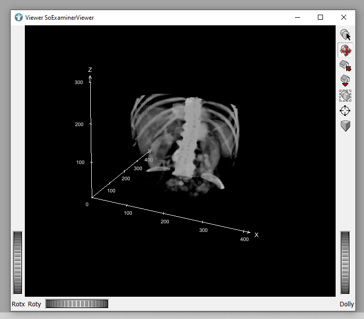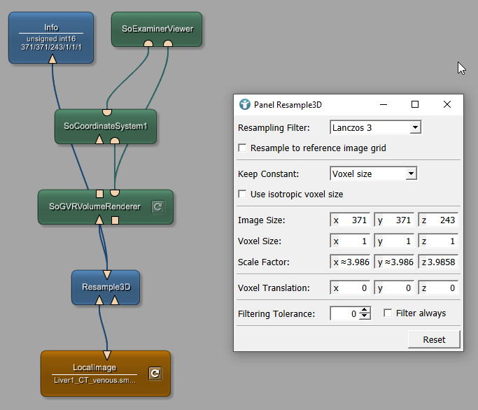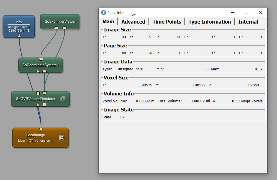Load the file Liver1_CT_venous.small.tif. The Info module shows detailed information about the image loaded by the LocalImage. Opening the SoExaminerViewer shows the voxel coordinate system of the loaded image. You may have to change the LUT in SoGVRVolumeRenderer, so that the image looks better.