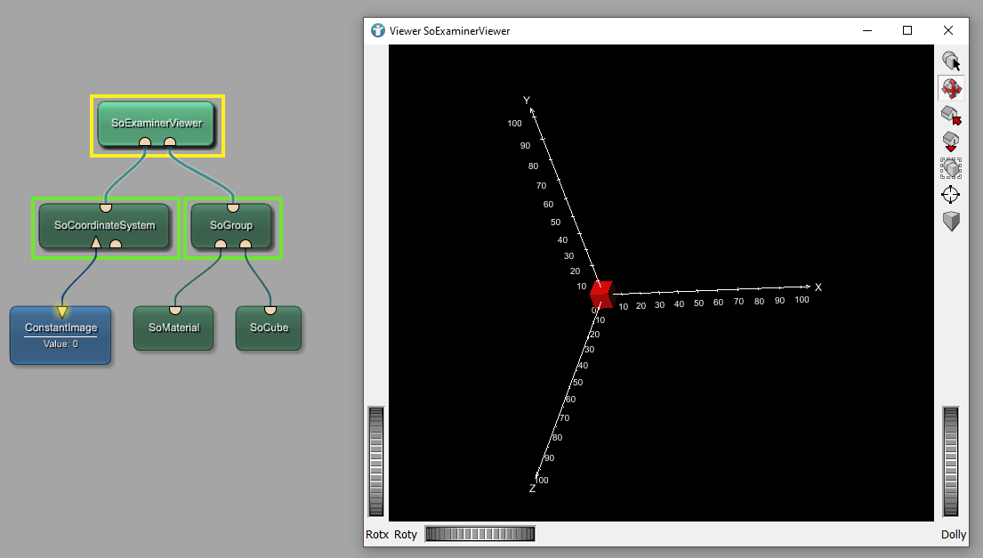 Placing an object into the Open Inventor scene of the SoExaminerViewer, in this case a SoCube with width, height, and depth of 10, places the object to the origin of the world coordinate system.