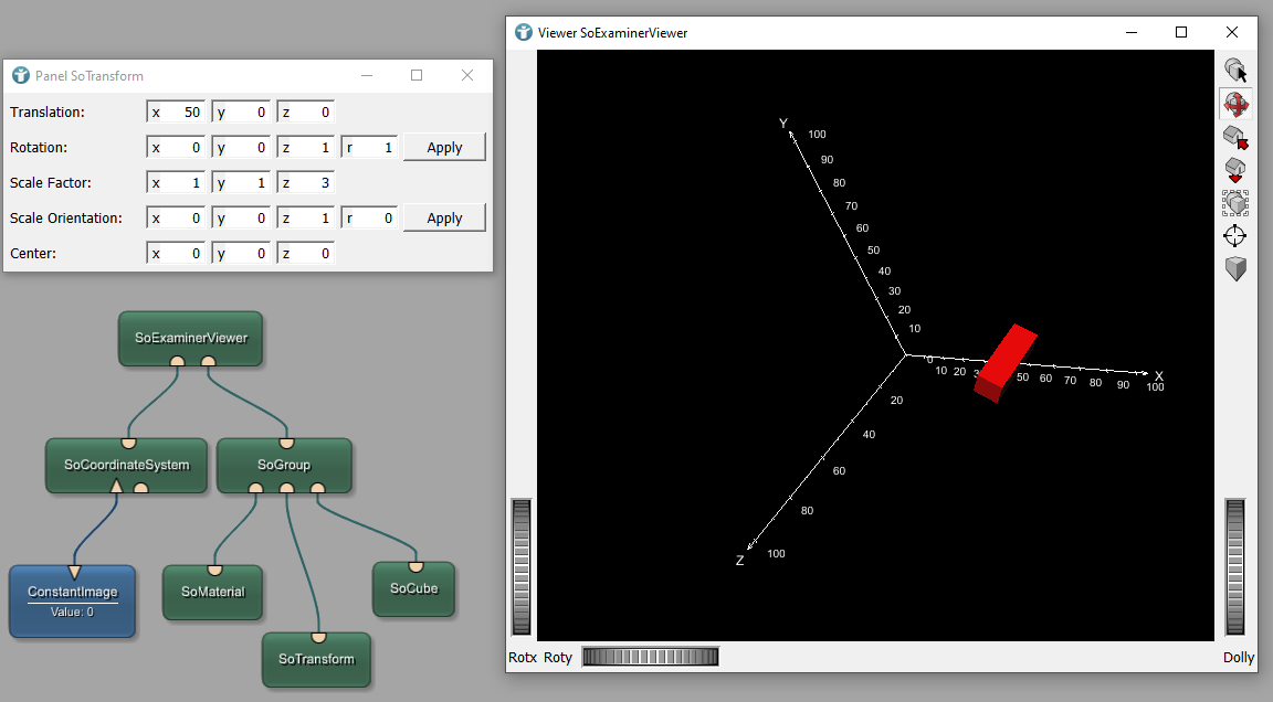 More complex transformations can be done by using the SoTransform module. Not only can you translate an existing object, but you can also rotate, scale, and shear.
