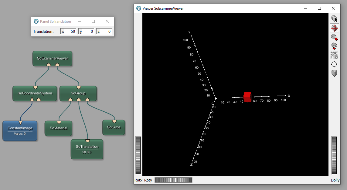 You can move an object in your scene, for example, by using a SoTranslation module. Update your network and add the module before your cube. Defining a translation vector (50, 0, 0) moves your cube by 50 in the x-direction based on the origin of the world coordinate system.