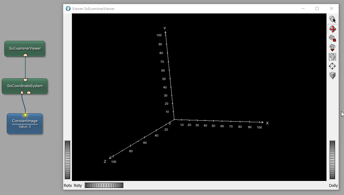 The ConstantImage module generates an artificial image with a certain size, data type, and a constant fill value. The origin of the image is at the origin of the world coordinate system; therefore, the SoCoordinateSystem module shows the world coordinate system. In order to have a larger z-axis, open the panel of the ConstantImage module and set IMage Size for Z to 256.