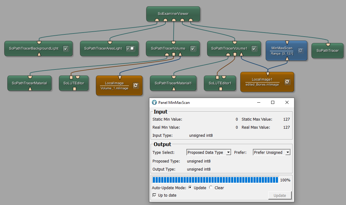 Replace the View2D module by a SoExaminerViewer. Add the modules SoPathTracerVolume and SoPathTracer to your workspace and connect them as seen below.