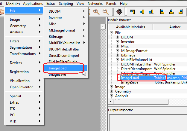 The standard Views Area contains the Output Inspector and Module Inspector. With the help of the Output Inspector, you can visualize the output of the modules.