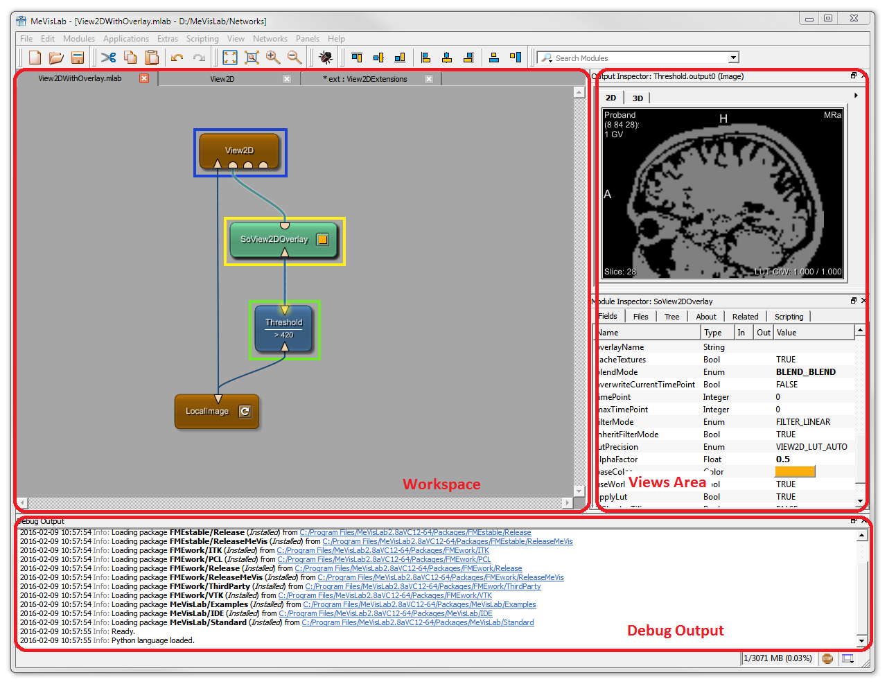 | Debug Output | The Debug Output shows debugging messages of your modules and the MeVisLab IDE. |