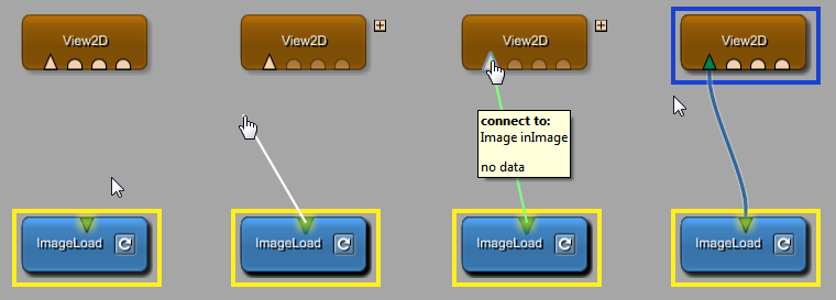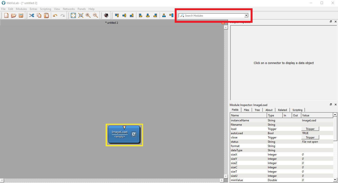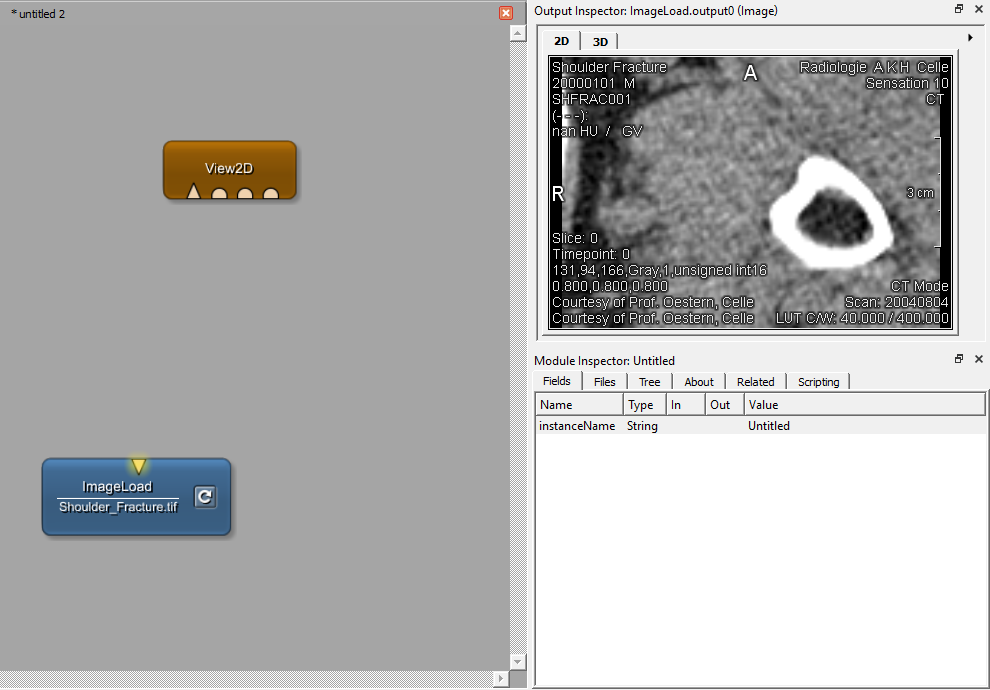 Instead of using the Output Inspector to inspect images, we’d suggest to add another viewer to the network. Search for the module View2D and add it to your workspace. Most modules have different connector options. Data is generally transmitted from the top side of a module to another module’s bottom side.
