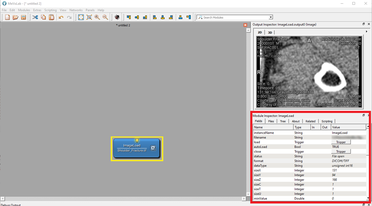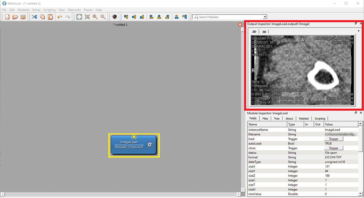 ImageLoad to open its panel. You can browse through your folders to select the data you’d like to open. Example data can be found in the MeVisLab DemoData directory $(InstallDir)/Packages/MeVisLab/Resources/DemoData located in the MeVisLab installation path. Select a file, for example, an MRI scan of a shoulder Shoulder_Fracture.tif. The image is loaded immediately and basic information of the loaded image can be seen in the panel.