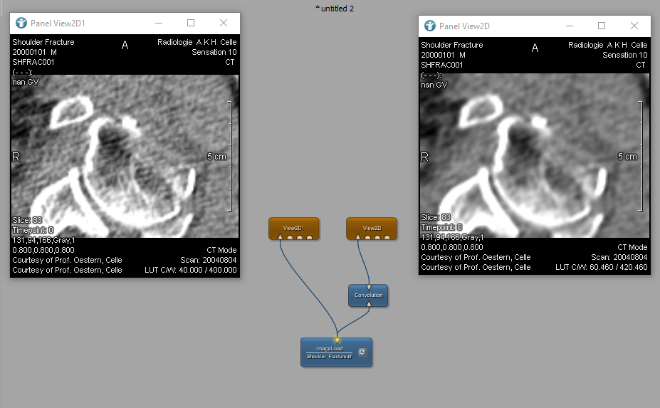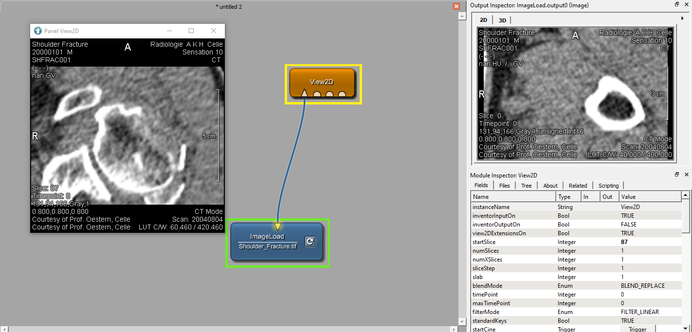 You can also inspect changes between processed (output connector) and unprocessed (input connector) images by adding a second or even third viewer to your network. “Layers” of applied changes can be inspected next to each other using more than one viewer and placing as well as connecting them accordingly. We will be using a second View2D module. Notice how the second viewer is numbered for you to be able to distinguish them better. It might be important to know at this point that numerous connections can be established from one output connector but an input connector can only receive one stream of data. Connect the module ImageLoad to the second viewer to display the images twice. You can now scroll through the slices of both viewers and inspect the images.