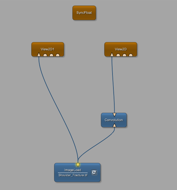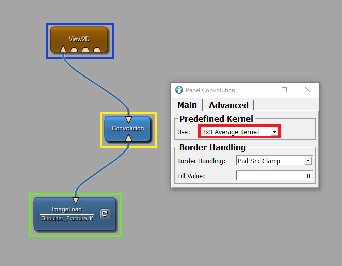 An average kernel will be used to smooth the image as our next step will be to actually process our image. Add the Convolution module to your workspace and disconnect the View2D module from the ImageLoad module by clicking