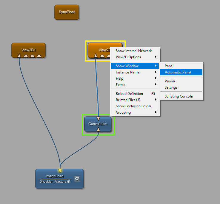 We will now establish a connection from the module SyncFloat to the second viewer, Viewer2D1. In order to do that, open the automatic panel View2D1. Establish a connection from the label SyncFloat to the label View2D1. Lastly, establish a connection between the parameter fields View2D1 to View2D.