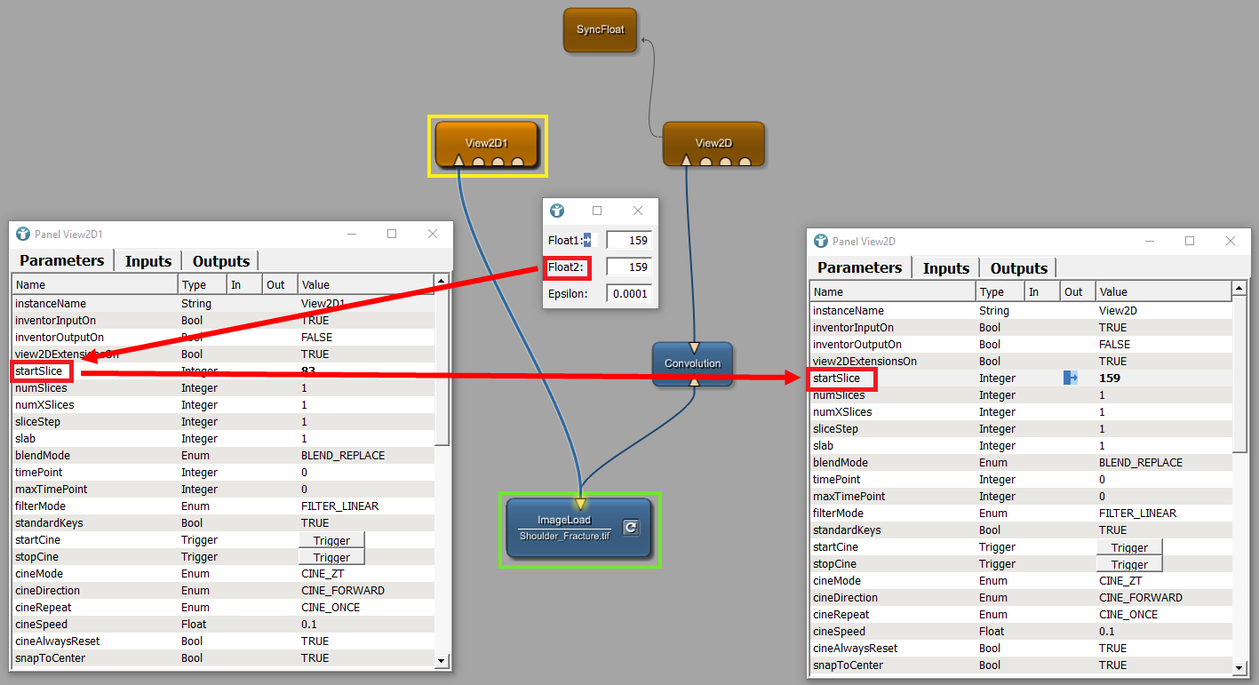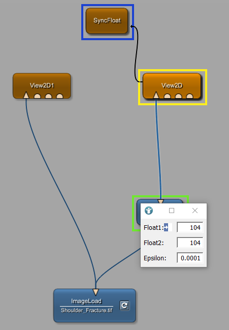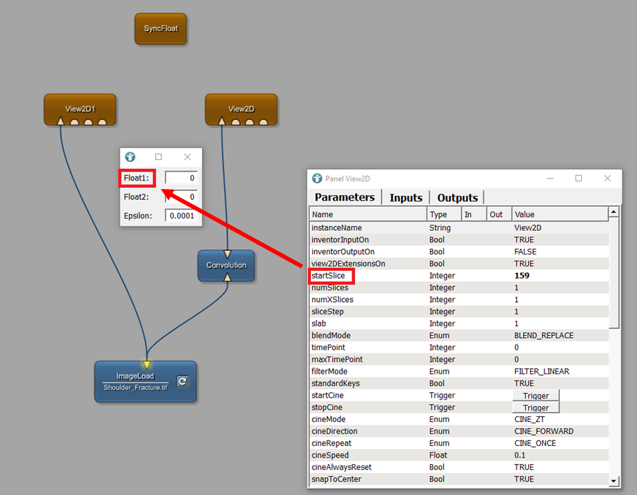 View2D, keep the button pressed, and drag the connection to the label SyncFloat.