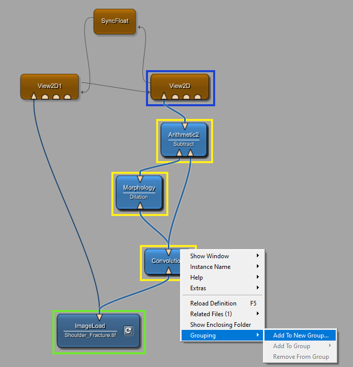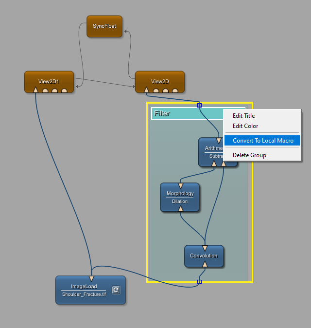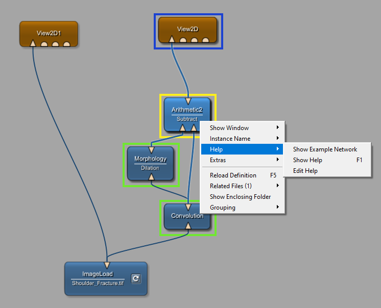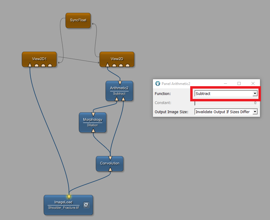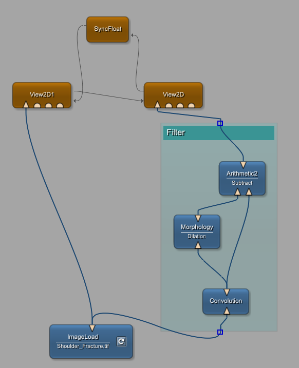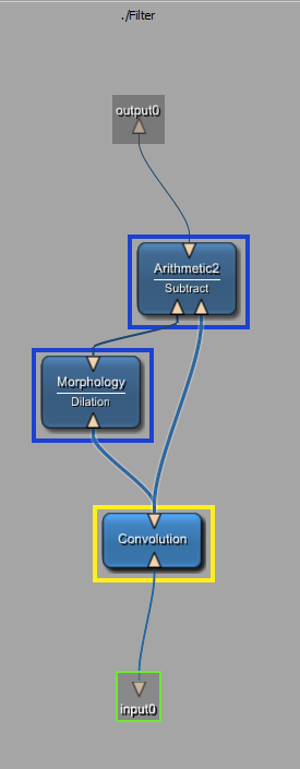 A contour filter can be created based on our previously created network. To finalize the filter, add the modules Arithmetic2 and Morphology to your workspace and connect the modules as shown below. Double-click