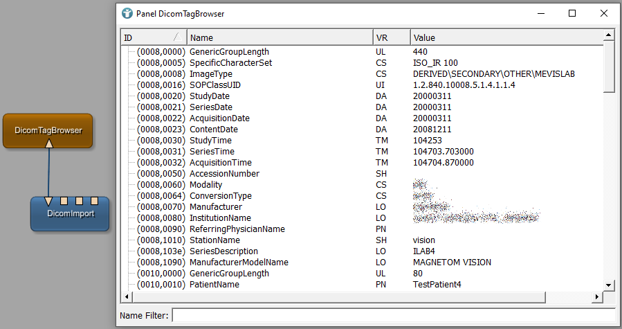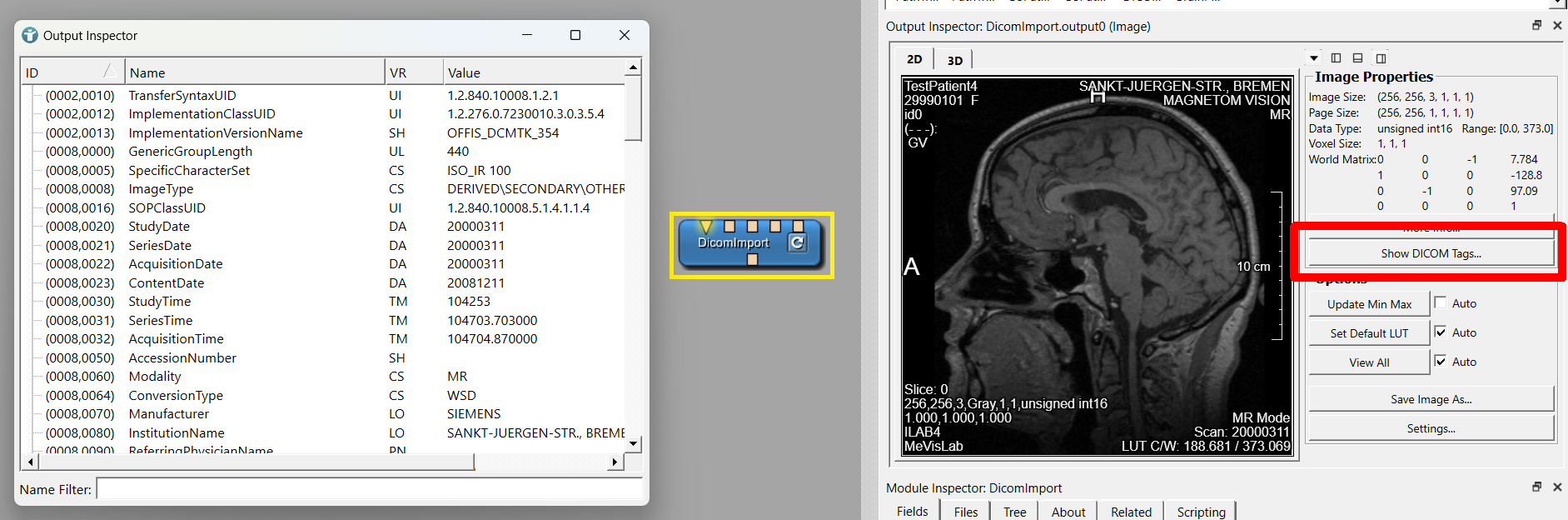 In MeVisLab versions later than 4.2.0, the Output Inspector provides the option to show the DICOM tags of the currently selected output directly. You do not need to add a separate DicomTagBrowser module anymore.