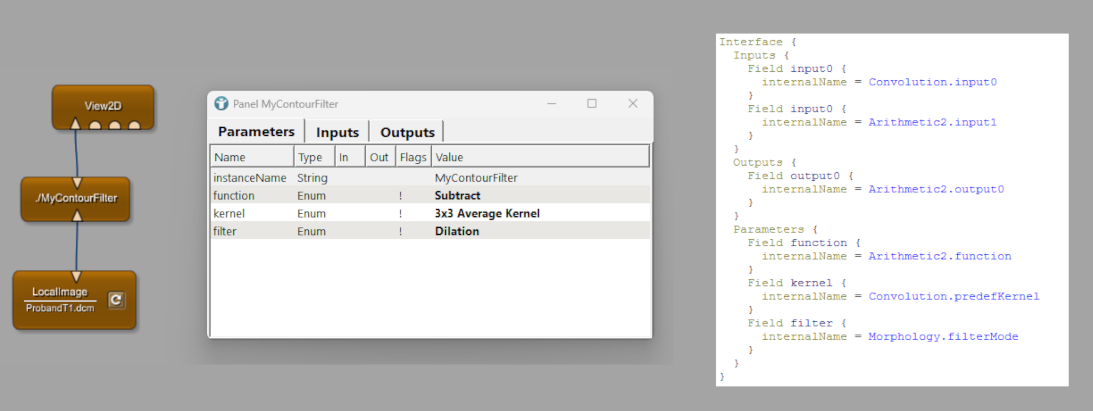 Like all other standard MeVisLab modules, macro modules have a defined interface with inputs, outputs, and parameters (fields). This interface allows it to interact with other modules in a larger network. They hide the complexity of the internal network or Python code, presenting a more simplified and manageable unit to the user.