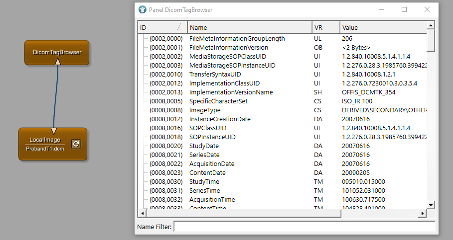 We are using a very simple network of predefined modules but you can also debug your self-written Python scripts. Add a LocalImage module to your workspace and connect it to a DicomTagBrowser module. The DicomTagBrowser module shows a table containing the DICOM tags of your currently opened file.