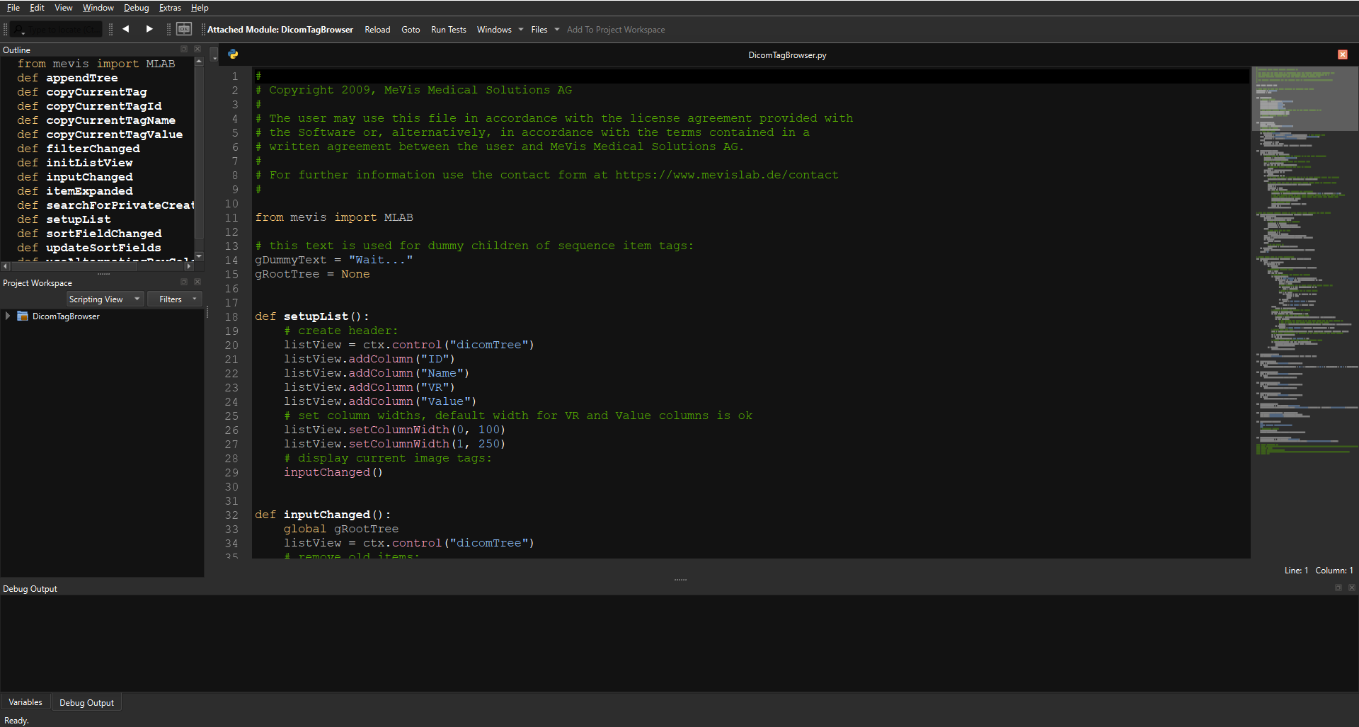 MeVisLab provides the powerful integrated text editor MATE. By default, MATE is used to create/edit files like Python scripts. In this tutorial, we want to show you how to debug Python scripts in MeVisLab.