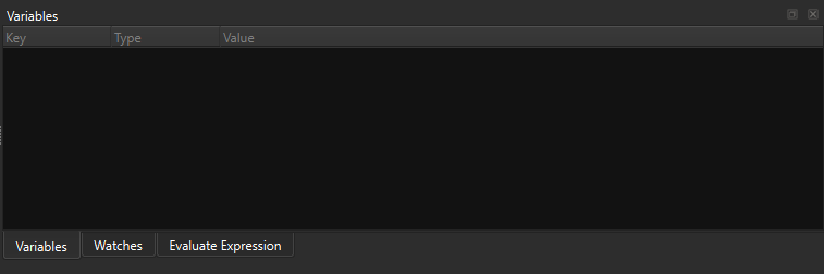 Another panel Variables/Watches/Evaluate Expression appears, where you can see all current local and global variables. Add your own variables to watch their current value and evaluate your own expressions.
