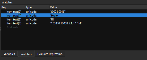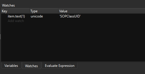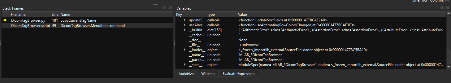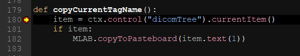 Select Watches panel and enter item.text(1). Again copy any tag name in MeVisLab DicomTagBrowser module. You will see that MATE shows an error. The reason is that the execution stops before executing the current line of code. Your Python code in line 180 defines the variable item, and therefore it is not yet defined at this moment.