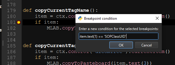 Now, the code execution is only stopped if you copy the tag name SOPClassUID. In the case another line is copied, the execution does not stop and just continues.