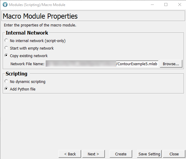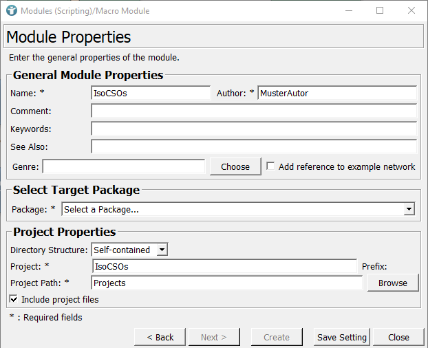 First, we condense the example network into a macro module and then we create a panel for that module. To create a macro module, use the Project Wizard, which you find under [ File → Run Project Wizard ]. Select Macro module and press Run.