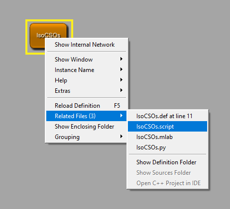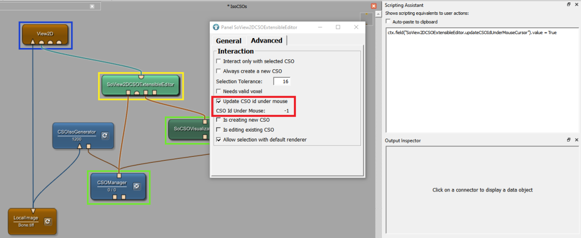 SoView2DCSOExtensibleEditor. Open its panel and select the tab Advanced. You can check a box to enableUpdate CSO id under mouse . If you now hover over a CSO, you can see its ID in the panel. We can save the internal network to save this functionality, but we can also solve our problem via scripting. The Scripting Assistant translated our action into code that we can use.