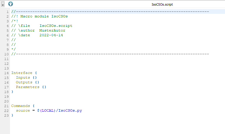 To design a panel and create a user interface for the macro module, open the .script file. You can see that a Commands section exists, which defines the Python file as source for all commands.