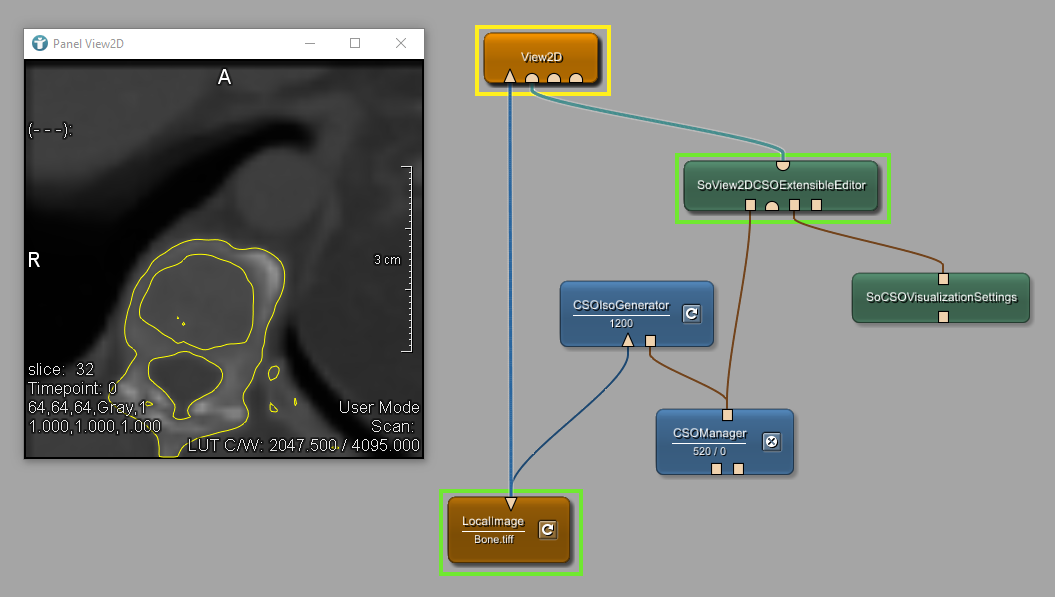 Add the following modules to your workspace and connect them as shown. Load the example image Bone.tiff.