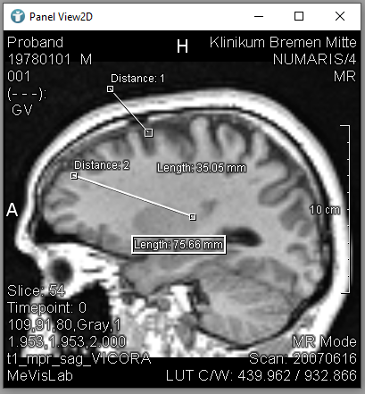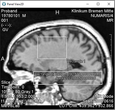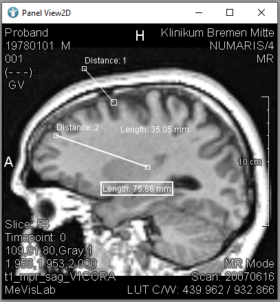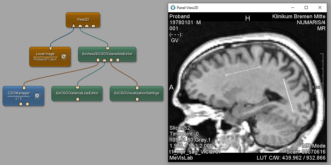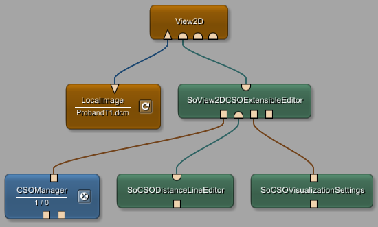 Add the modules LocalImage and View2D to your workspace and connect them as shown below. Load the file ProbandT1.dcm from MeVisLab demo data. In order to create contours (CSOs), we need a SoView2DCSOExtensibleEditor module. It manages attached CSO editors, renderers, and offers an optional default renderer for all types of CSOs.