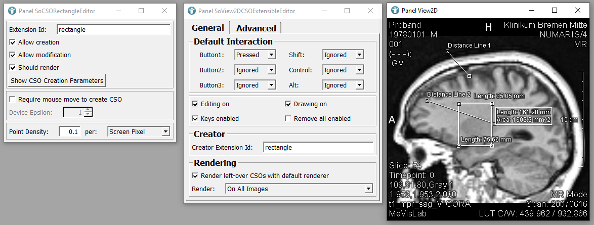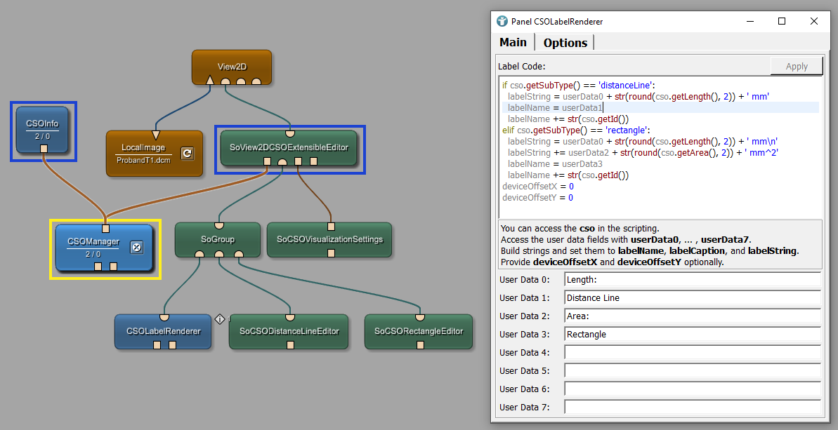 You can also add multiple CSO editors to see the different options. Add the SoCSORectangleEditor module to your workspace and connect it to the SoGroup module. As we now have two different editors, we need to tell the CSOLabelRenderer which CSO is to be rendered. Open the panel of the SoCSODistanceLineEditor. You can see the field SoCSORectangleEditor. You can see the field