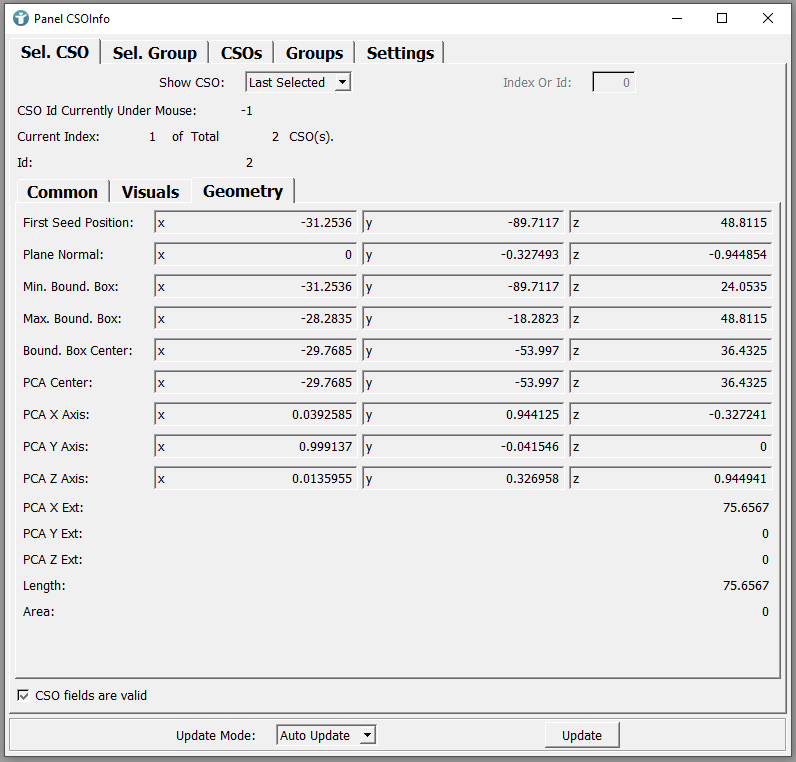 In order to see all possible parameters of a CSO, add a CSOInfo module to your network and connect it to the CSOManager. The geometric information of the selected CSO from CSOManager can be seen there.