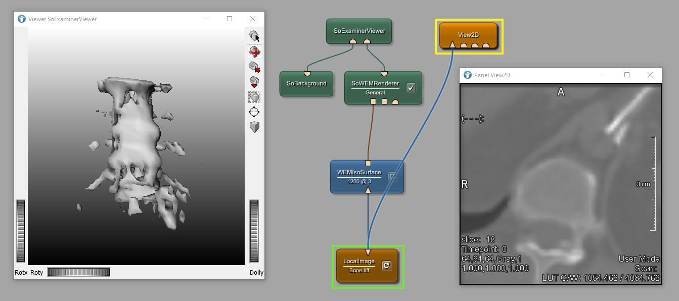At first, we will create a WEM out of a voxel image using the module WEMIsoSurface. Add and connect the shown modules. Load the image $(DemoDataPath)/Bone.tiff and set the WEMIsoSurface to 1200. Tick the checkbox WEMIsoSurface creates surface objects out of all voxels with an isovalue equal or above 1200 (and smaller than the image’s maximum value). The module SoWEMRenderer can now be used to generate an Open Inventor scene, which can be displayed by the module SoExaminerViewer.