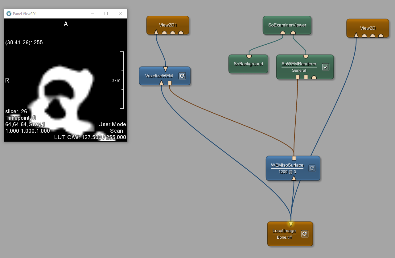 It is not only possible to create WEMs out of voxel images. You can also transform WEMs into voxel images: Add and connect the modules VoxelizeWEM and View2D as shown and press the VoxelizeWEM.