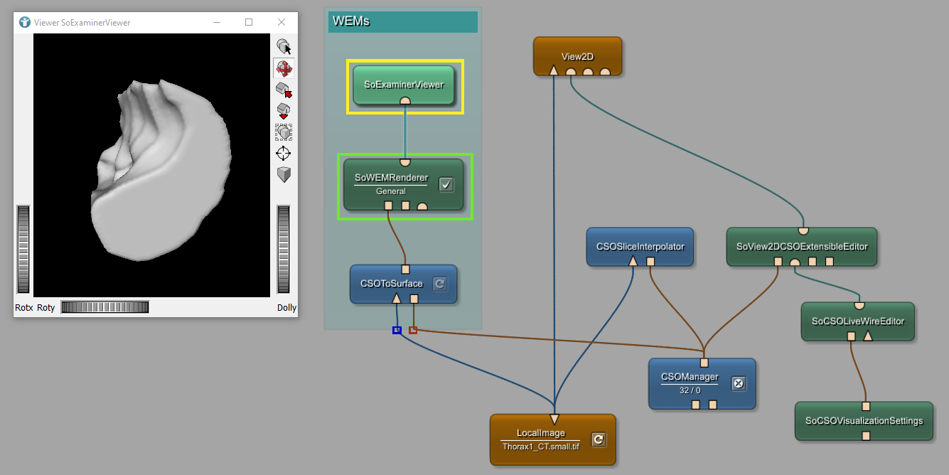 Next, add and connect the module CSOToSurface to convert CSOs into a surface object. To visualize the created WEM, add and connect the modules SoWEMRenderer and SoExaminerViewer.