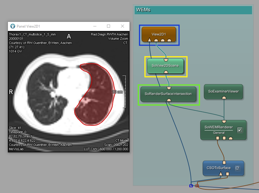 It is also possible to display the WEM in 2D in addition to the original image. In order to do that, add and connect the modules SoRenderSurfaceIntersection and SoView2DScene. The module SoRenderSurfaceIntersection allows to display the voxel image and the created WEM in one viewer using the same coordinates. In its panel, you can choose the color used for visualizing the WEM. The module SoView2DScene renders an Open Inventor scene graph into 2D slices.
