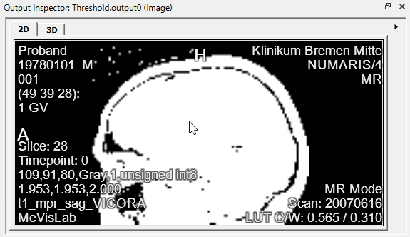 Now, all voxels having a value lower or equal 60 are set to 0, all others are set to 1. The resulting image from the Threshold module is a binary image that can now be used as a mask by the Mask module.