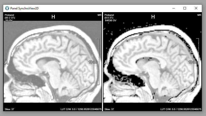 . You can see that the background of your images gets very bright and changes based on the LUT are applied to all voxels of your input image - even on the background. Hovering your mouse over the image(s) shows the current gray value under your cursor in Hounsfield Unit (HU).
