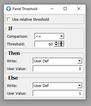 Thresholdapplies a relative or an absolute threshold to a voxel image. It can be defined what should be written to those voxels that pass or fail the adjustable comparison. - The module