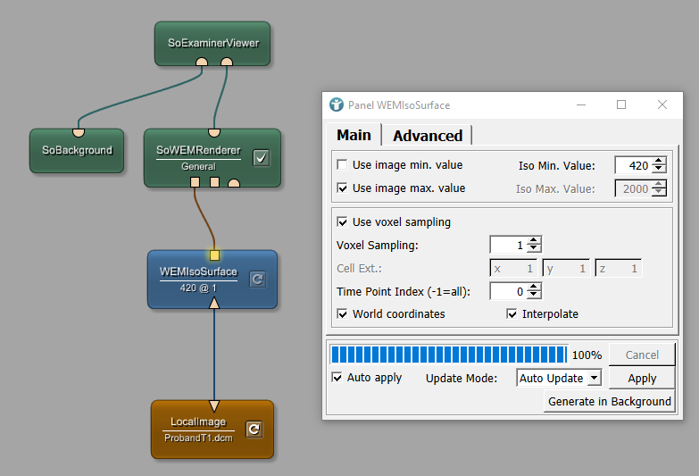 Add a LocalImage module to your workspace and select load $(DemoDataPath)/BrainMultiModal/ProbandT1.dcm. Add a WEMIsoSurface, a SoWEMRenderer, a SoBackground, and a SoExaminerViewer module and connect them as seen below. Make sure to configure the WEMIsoSurface to use a