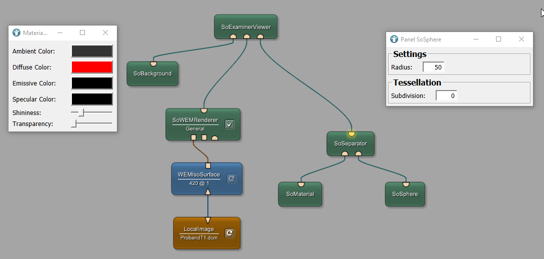 We now want to add a three-dimensional sphere to our scene. Add a SoMaterial and a SoSphere to your network, connect them to a SoSeparator and then to the SoExaminerViewer. Set your material to use a Diffuse Color red and adapt the size of the sphere to Radius 50.