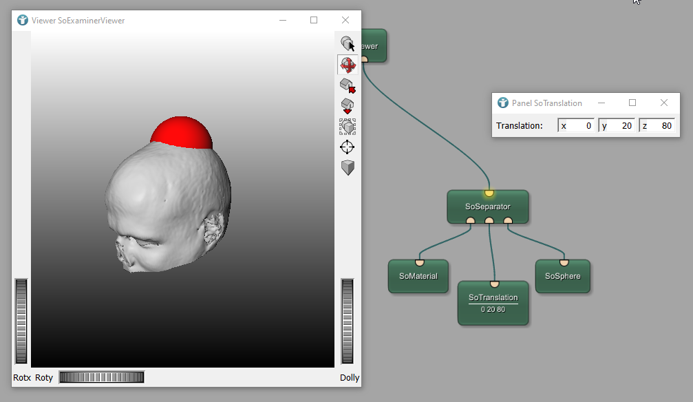 In order to define the best possible location of the sphere, we additionally add a SoTranslation module and connect it to the SoSeparator between the material and the sphere. Define a translation of x=0, y=20 and z=80.