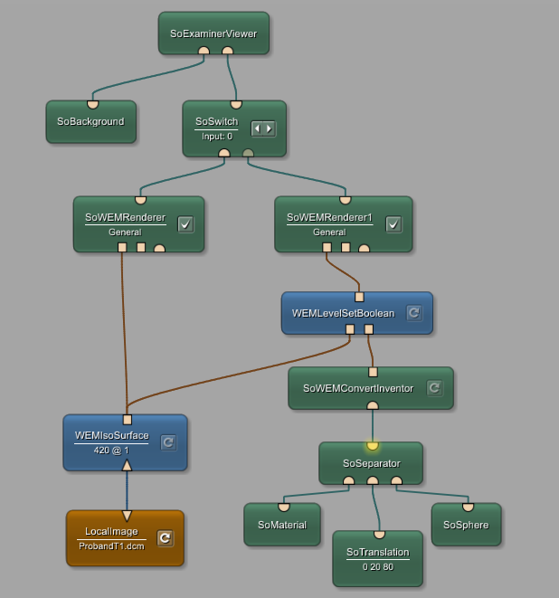 We now want to subtract the sphere from the head to get a hole. Add another SoWEMRenderer, a WEMLevelSetBoolean, and a SoWEMConvertInventor to the network and connect them to a SoSwitch as seen below. The SoSwitch also needs to be connected to the SoWEMRenderer of the head. Set your WEMLevelSetBoolean to use the Mode Difference.
