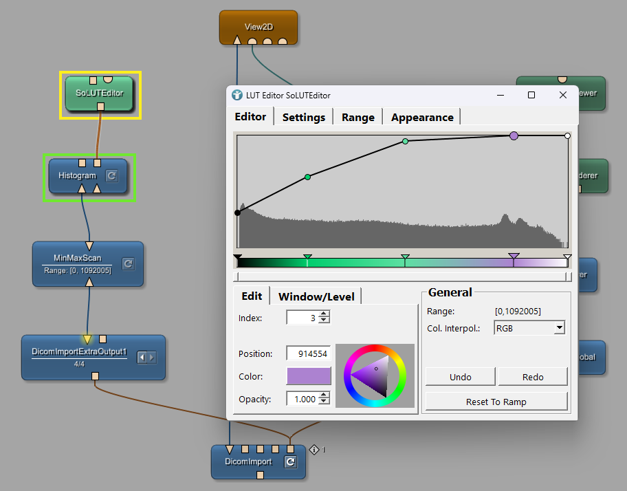 Add a Histogram and a SoLUTEditor module to calculate the image’s intensity distribution and define a colored lookup table for the overlay.