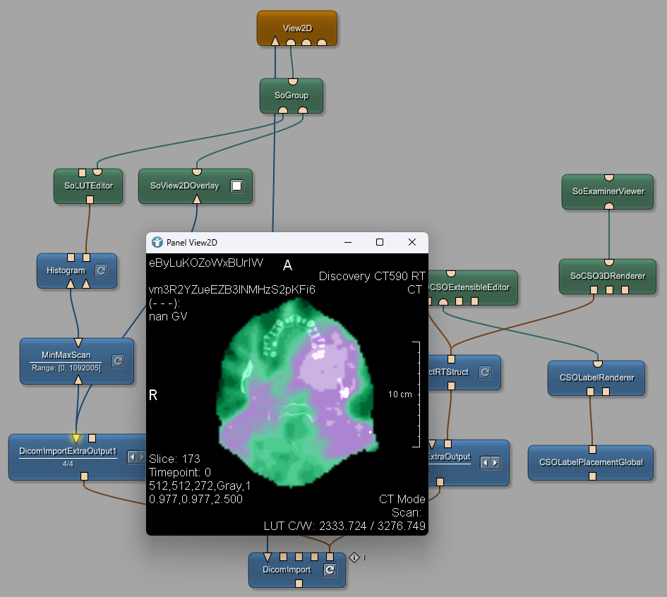 The lookup table shall be used for showing the RT Dose data as a semitransparent overlay on the CT image. Add a SoView2DOverlay and a SoGroup module to your network. Replace the input of the View2D module from the SoView2DCSOExtensibleEditor with the SoGroup.
