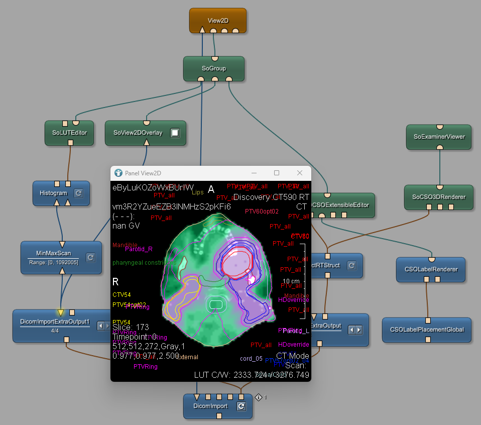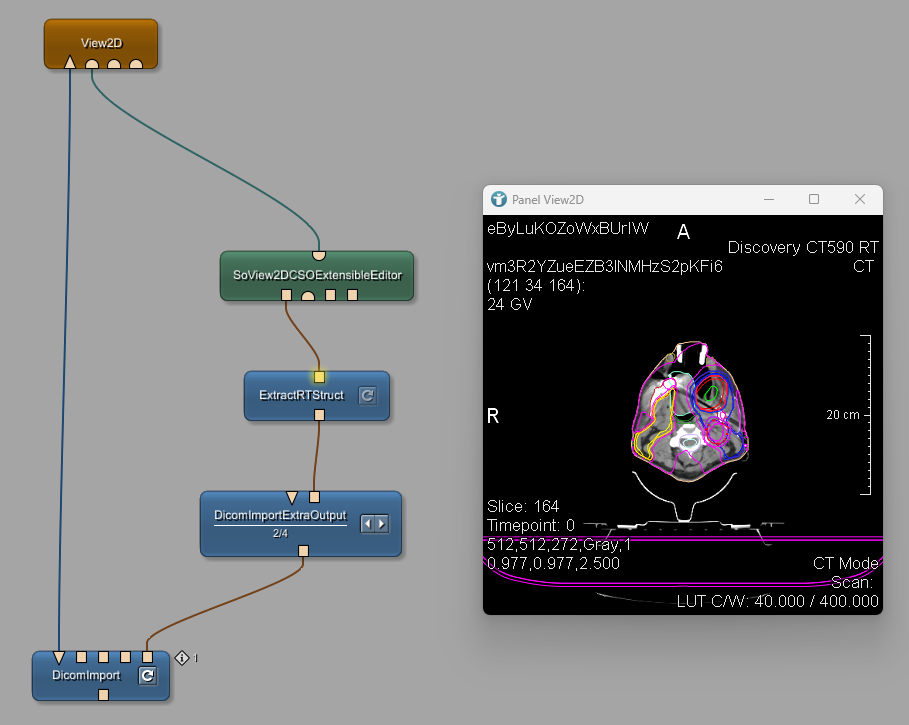 If you want to visualize the RT Struct contours together with the RT Dose overlay, connect the SoView2DCSOExtensibleEditor module and the SoGroup module.