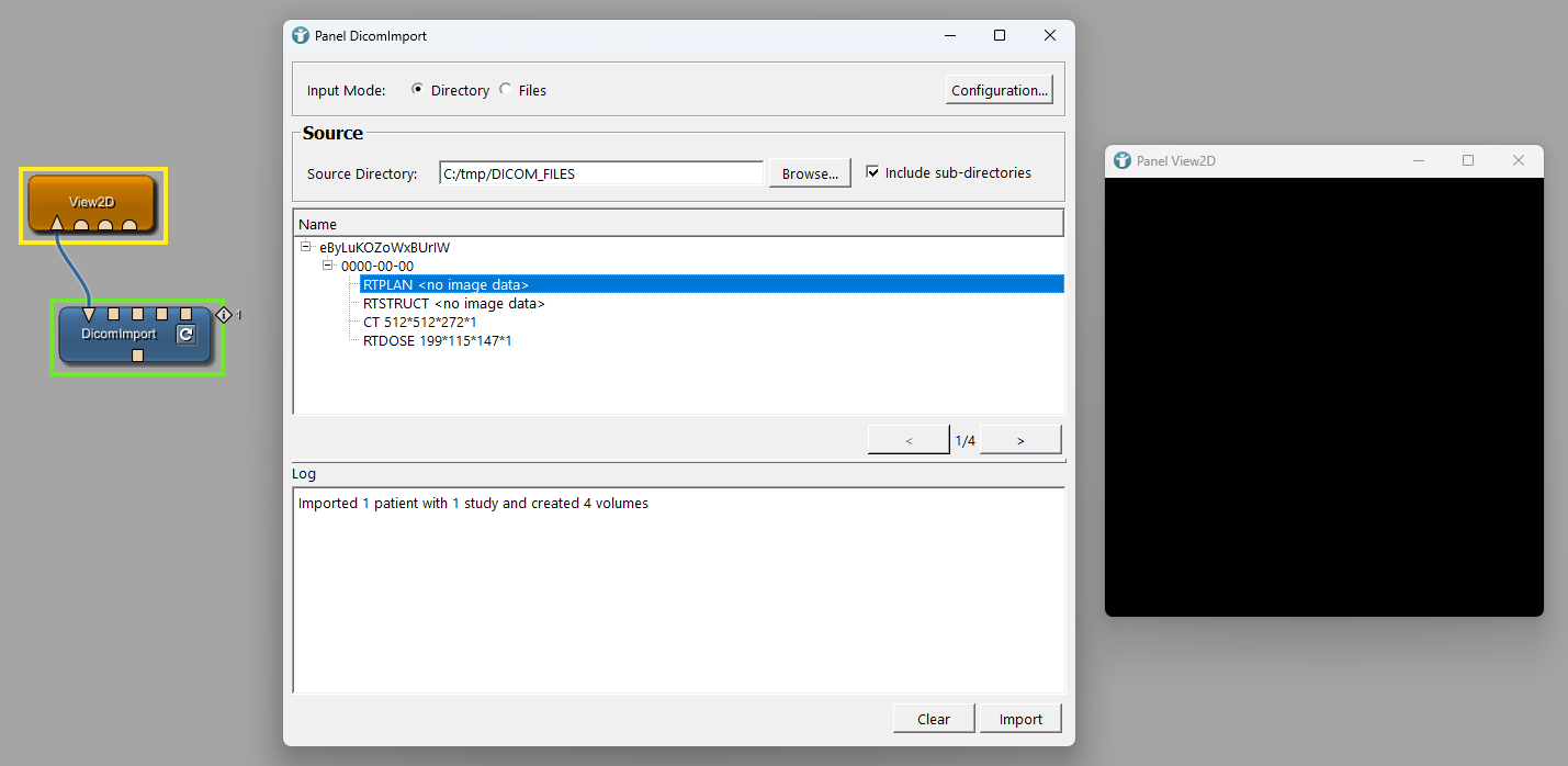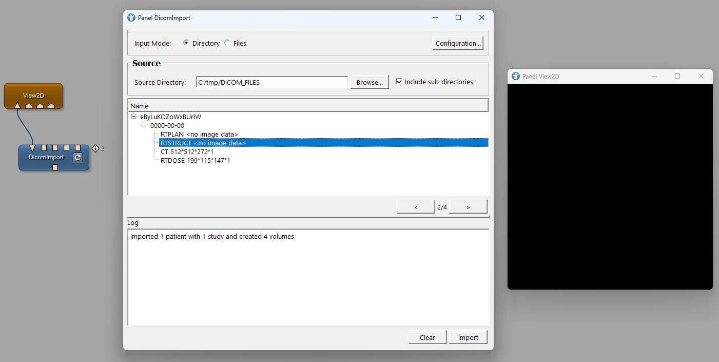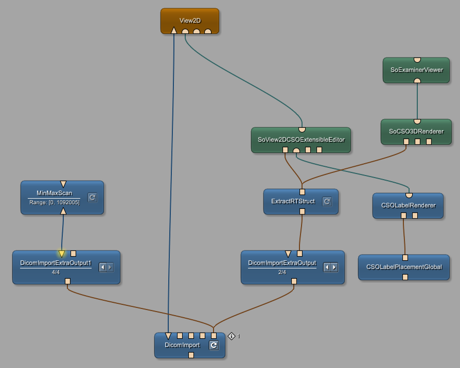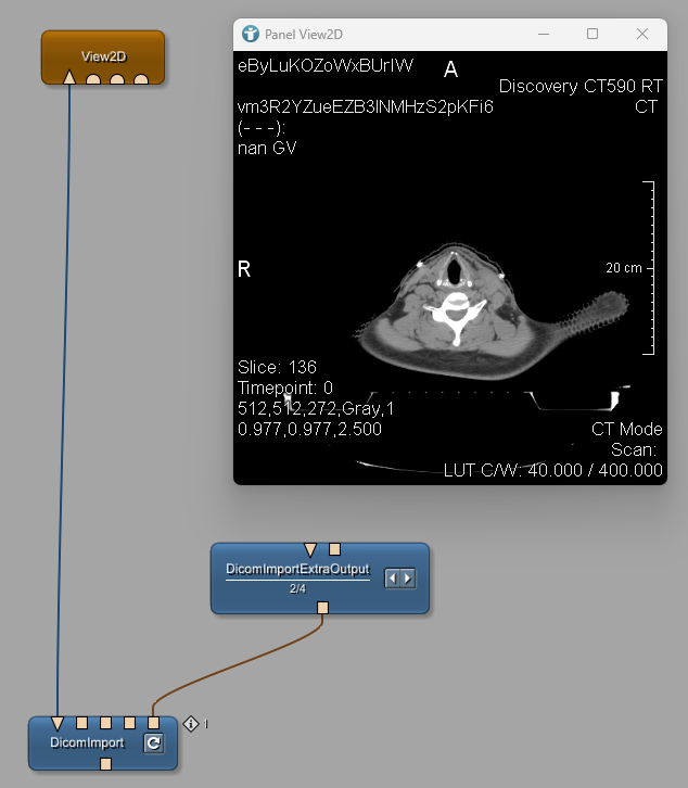 We now want to view the CT images and the RTSTRUCT data together. The module DicomImport only allows to select one single object. In order to select more than one object, we use a DicomImportExtraOutput module. Select the CT series in the DicomImport module and the RTSTRUCT in the DicomImportExtraOutput module.