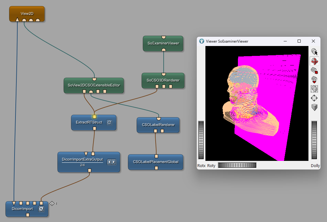 Add a SoCSO3DRenderer and a SoExaminerViewer module and connect them to the ExtractRTStruct module. The SoCSO3DRenderer will render the contours (CSOs) into the SoExaminerViewer.