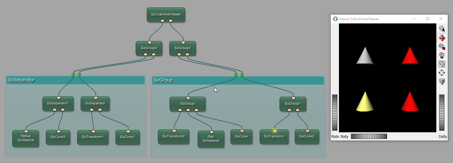 In the network above, we render four SoCone objects. The left side uses the SoSeparator modules, the right side uses the SoGroup ones. There is a SoMaterial module defining one of the left cone objects to be yellow. As you can see, the SoMaterial module is only applied to that cone, the other left cone remains in its default gray color, because the SoSeparator module isolates the its children from the rest of the scene graph.