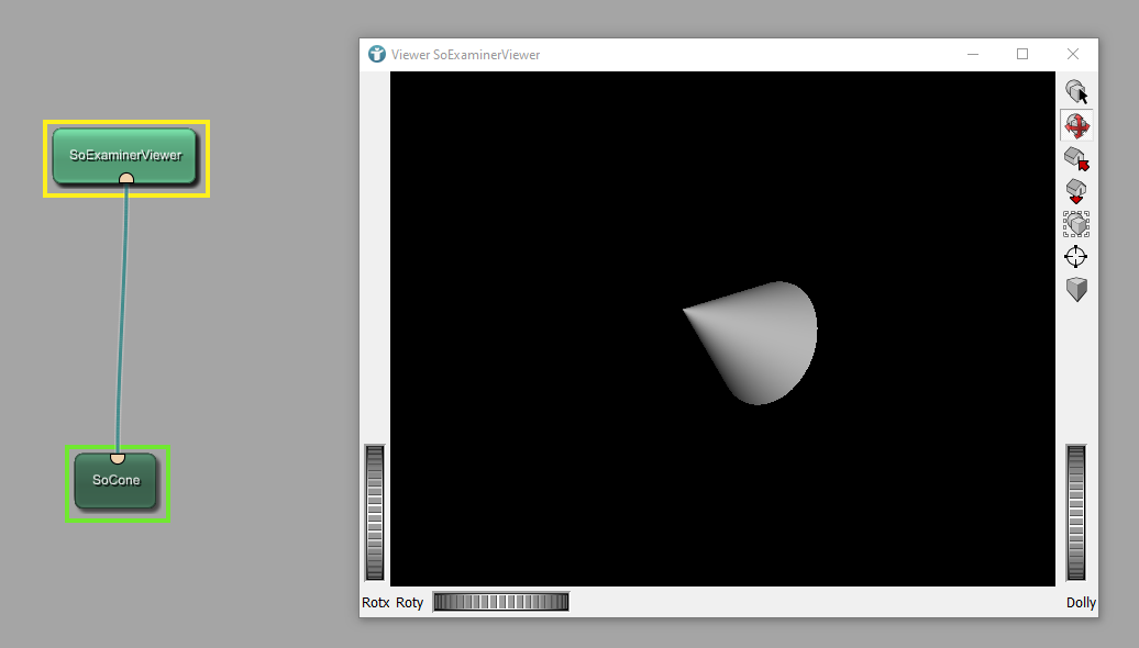 First, add the modules SoExaminerViewer and SoCone to the workspace and connect both modules as shown. The module SoCone creates a cone shaped object, which can be displayed in the viewer SoExaminerViewer.